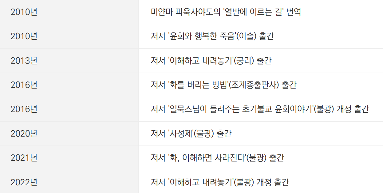 | 2022년 | 저서 '이해하고 내려놓기'(불광) 개정 출간 |